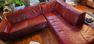 Mooie rode leren hoekbank gratis af te halen. Er zit een klein scheurtje in het zitgedeelte van ongeveer 2 cm. De bank is gebruikt en heeft slijtageplekken, maar kan zeker nog een ronde mee. Ideaal vo