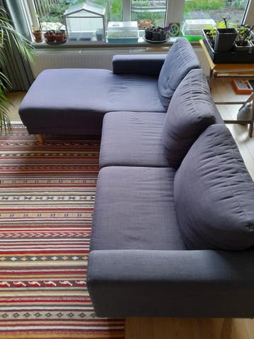 Gratis! Bank van jysk. Ongeveer 8 jaar oud. Niet-rokers huis en geen huisdieren. Wat verkleuring door de zon onder de kussens en een paar kleine vlekjes. Bij het chais lounge deel is de bank iets inge