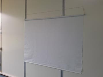 Het is in essentie een wit rolgordijn maar ik heb deze dus als projectie scherm gebruikt. Hij functioneert dan ook niet meer als rolgordijn omdat het rol mechanisme en kettinkje eraf is gehaald. Grati