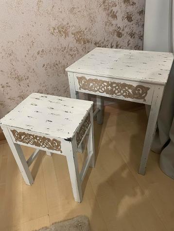 Leuke set van een kleine en een grotere bijzettafel( 2 stuks) , plus grijze poef (2 stuks). Kandelaars voor kaarsen en een sierladder. Alles mag gratis worden opgehaald. Graag alles in een keer mee. N