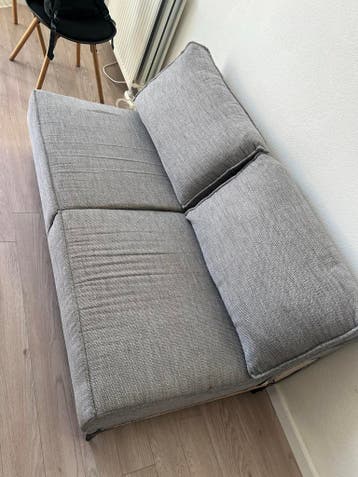 Gratis: een grijze tweezitsbank met een breedte van 150 cm, diepte van 90 cm en hoogte van 65 cm. De bank heeft een stoffen bekleding en twee losse rugkussens.