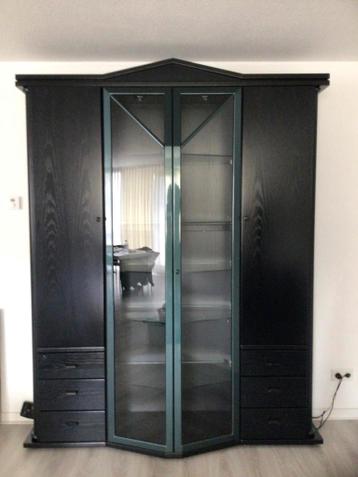 Essenhout zwart/metallic. Inclusief verlichting. Kast is gekocht in jaren 80. Gratis af te halen. Kast is volledig gedemonteerd en staat in opslag.