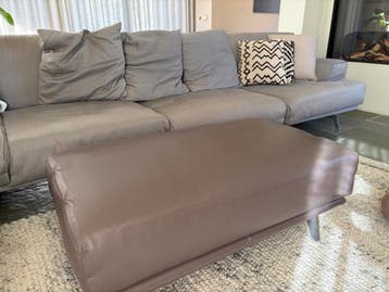 Deze grote grijze bank bestaat uit 3 losse elementen. De bank heeft een stoffen bekleding en metalen poten. Er zit ook een losse hocker bij. Er zitten wel wat vlekken op, maar als je zo een stoomappar