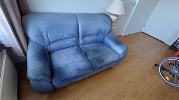 Gebruikte 2-zits bank in lichtblauw stof. Afmetingen zijn 155x90x90 cm met een zithoogte van 43 cm. Gratis op te halen in arnhem. Zit nog prima. Wel wat vlekjes in de stof.