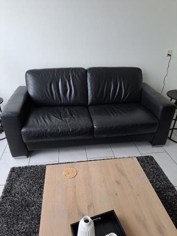 Een set van twee banken 2,5 zits uitgevoerd in zwart leer. De banken hebben een strak design met aluminium poten. De banken zijn goed onderhouden en komen uit een rookvrij en huisdiervrij huis. Lengte