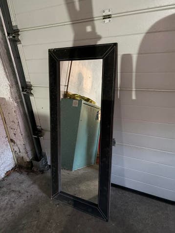 Een spiegel met een zwarte rand. De rand heeft een wit stiksel. De spiegel is rechthoekig en kan in de woonkamer staan.