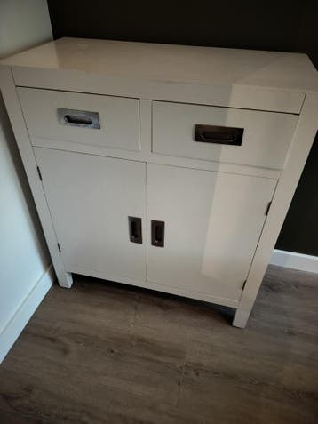 Wit kastje met twee laden, twee deuren en een plank. Afmetingen 75cm breed, 36cm diep, 85cm hoog. Heeft wat beschadigingen op bovenblad, zie foto. Makkelijk over te verven. Kan niet uit elkaar maar is