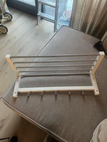 Kapstok met een witte houten basis en metalen stangen voor de hoedenplank. Er zijn vijf metalen haken aan de onderkant. De kapstok is 79 cm breed en 32 cm diep.