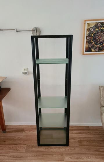 Strakke zwart metalen vitrinekast/stellingkast. De kast heeft een zwaar metalen stalen frame met 4 matglazen/melkglazen planken. Afmetingen 47 x 37 x 158 cm. Het frame is uit elkaar te halen, handig v