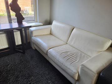 Deze crèmekleurige tweezitsbank is nog prima voor een volgende ronde. De bank is niet doorgezakt en ziet er netjes uit. Er zijn wat gebruikssporen zichtbaar op het leer.