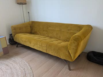 Gele bank, 210 cm breed, 85 cm diep en 77 cm hoog. De bank is gebruikt en gratis af te halen. Gaat weg ivm aanschaf nieuwe bank.