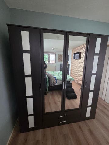 Gratis af te halen, al gedemonteerd, 2 kledingkasten. Een 3 en een 4 deurs. Bouwtekeningen bijgesloten. Kleur: bruin/zwart met witte vlakken en spiegels. 3-Deurskledingskast is compleet en alles funct