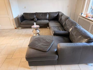 U bank van leer in antracietgrijs. De bank is gebruikt en heeft een chaise longue aan de rechterkant. De bank is gratis af te halen na overleg.
