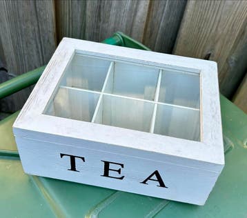 Dit is een wit theedoosje met zes vakken. Het doosje heeft een glazen deksel en op de voorkant staat 'tea' geschreven. Het is een handig doosje om theezakjes in op te bergen.
