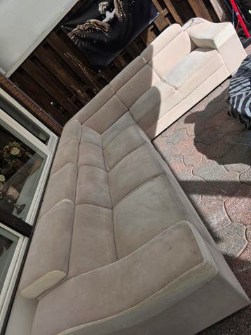 Grote hoekbank gratis af te halen. De stof is nergens kapot, maar het leer is overal afgebladderd zoals te zien is op de foto's. De bank kan in 4 delen vervoerd worden, wat het ophalen vergemakkel