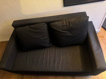 Zwarte bank met opslagruimte. De breedte van de bank is 1,4 meter. Met de leuning uitgeklapt is de totale breedte 1,3 meter. Een van de leuningen is wat ingezakt.