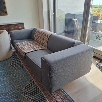 Gratis af te halen 235 cm lang diepte 95 cm. Zit 55 cm. Hoogte 70 cm. Grijze bank. Zit scheur in en de kat heeft eraan gekrabd.