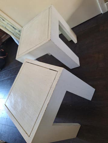 Gratis af te halen 3 goede teakhouten tafeltjes of krukjes. Er mankeert niets aan, alleen de verf is oud en lelijk. Degelijke kwaliteit. Zeker de moeite waard om ze even over te verven naar smaak.