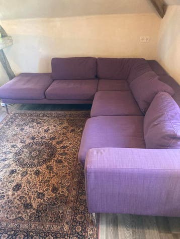 Een paarse hoekbank met stoffen bekleding. De bank bestaat uit meerdere delen en heeft metalen poten. De kussens zijn los. In zeer goede staat. Gratis op te halen binnen 3 dagen.
