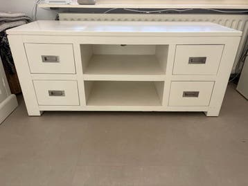 Wit tv meubel met vier handige lades en twee open vakken voor al je media-apparatuur. 128Cm x 45 x 55,5cm alleen op te halen in alphen aan den rijn.