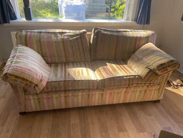 Wegens verandering van interieur gratis op te halen: tweezits designer bank met heerlijk zitcomfort. De bank is bekleed met een gestreepte stof in zachte tinten, wat zorgt voor een warme en uitnodigen