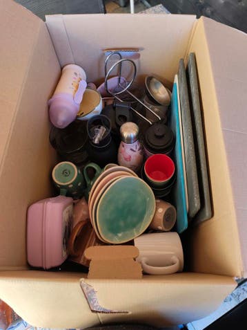Een doos vol met diverse keukenartikelen. Er zitten bordjes, kopjes, bakjes, een drinkfles en glazen snijplanken in. Alles is gratis af te halen.