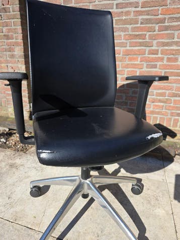 Zwarte bureastoel. Stof is beschadigd aan de voorkant. Kan nog omhoog en omlaag. Stoel gaat weg omdat wij hem vervangen hebben. We zijn aan het opruimen. Kijk eens bij mijn andere advertenties.