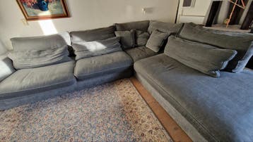 Grote grijze hoekbank met veel kussens. De bank heeft een lange chaise longue aan de rechterkant. De stof is grijs en heeft een lichte textuur. Er zijn wat gebruikssporen zichtbaar maar verder kwalita