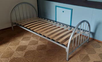 Eenvoudig demontabel bed, zie foto's. Buitenmaten: lang 210, breed 95, hoogte onderzijde matras 29, totale hoogte 71.