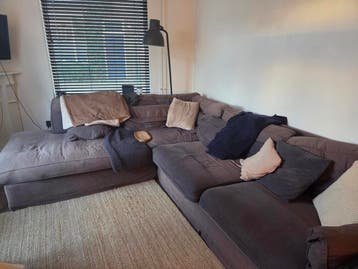 Heerlijk zittende en grote hoekbank. Wel wat slijtage maar met plaid erover nog een van de lekkerst liggende banken die je kan hebben. Afmetingen zijn 325cm bij 265cm.