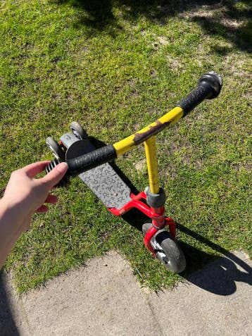 Deze puky driewieler step is duidelijk gebruikt en daarom gratis. Alles werkt wel gewoon. Eén van de handvatten is kapot. De step is rood met een geel stuur en heeft een grijs voetenplankje.