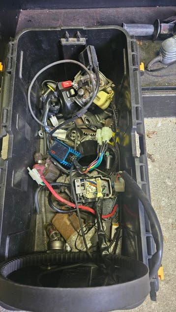 Voor de hobbyist in 4 takt chinese scooters. Een kist vol met verschillende onderdelen. Er zitten onder andere een cdi unit, een carburateur en diverse kabels en schakelaars in. Tevens een oliebar en