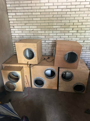 Vijf afzuigers in softboxen. Drie stuks zijn 5000m3 en twee stuks zijn 3250m3. Ze zijn gebruikt en hebben wat gebruikerssporen. De afzuigers zijn nog functioneel. Liefst allemaal tegelijk weg. Wel oph