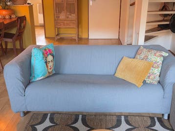 Deze ikea klippan bank is gratis af te halen. De bank is grijs van kleur en heeft een stoffen bekleding. Er passen twee tot drie personen op. De bank is gebruikt, heeft een wasbare hoes