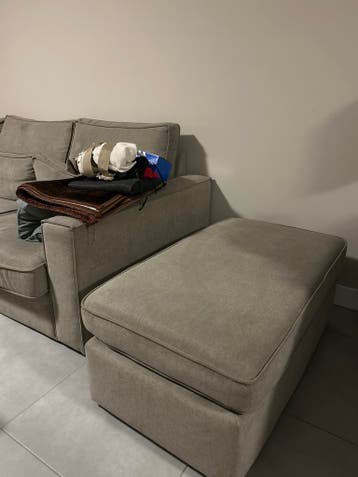 Deze beige poef mag gratis mee. Hij is gebruikt en heeft een stoffen bekleding. De poef is rechthoekig van vorm.