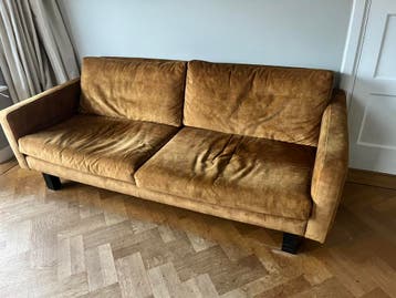 Nog mooie bank, okergeel velours lxbxh 206x100x76. Wij hebben een andere kleur gekocht.