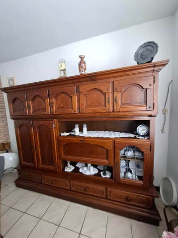 Prachtige, massieve eiken wandkast met veel opbergruimte. De kast is voorzien van diverse deuren, lades en open vakken, ideaal voor het opbergen van servies, boeken of decoratie. Een tijdloos meubelst