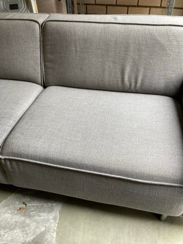 Een grijze bank met twee zitkussens en twee rugkussens. De bank heeft brede armleuningen en staat op kleine pootjes. De stof is effen grijs.