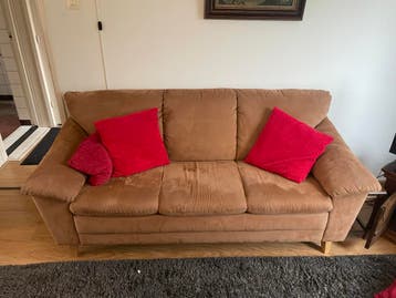 Een bruine driezitsbank met stoffen bekleding. De bank heeft drie zitkussens en twee armleuningen. De bank staat op houten pootjes.