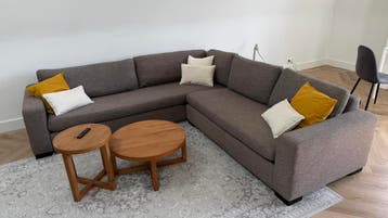 Deze ruime en comfortabele hoekbank is 2.70Cm bij 2.60Cm de bank heeft een neutrale grijze/bruine stof. De kussens krijg je bij de bank. De bank heeft hier en daar wat haakjes in de stof maar kan nog