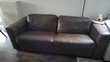 Comfortabele 2-zits leren bank in een mooie donkerbruine kleur. Zit nog prima en is stevig. Ideaal voor een tweede woonkamer, studentenkamer of hobbyruimte. De bank heeft wel zichtbare gebruikssporen