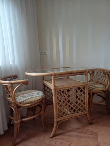 Glazen rotan tafeltje met twee stoelen. In goede staat op te halen in leiderdorp. 98 Cm lengte en 52 cm breedte.