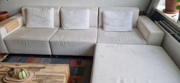 Een stevige witte bank met een hoekopstelling. De bank heeft een stoffen bekleding en bestaat uit meerdere delen. Er zitten ook drie losse kussens bij. Er zitten wel wat vlekken in. Ophalen voor 15 ap