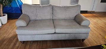 Deze tweepersoonsbank is van het merk rofra. De bank heeft een lichtgrijze kleur met een patroon. De bank heeft twee zitkussens en twee rugkussens. De poten zijn donkerbruin.