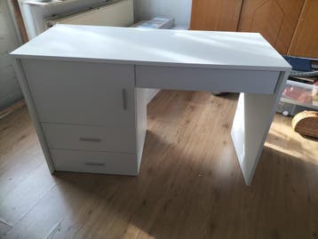 Mooi wit bureau, ideaal voor een thuiskantoor of studeerkamer. Het bureau is voorzien van een handig kastje met een plank en een lade, en daaronder nog twee extra lades voor voldoende opbergruimte. He