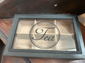 Deze theedoos heeft een zwart frame en een doorzichtige deksel met de tekst "tea". Binnenin zijn er zes vakken om theezakjes in op te bergen. De vakken zijn van een lichte houtkleur.