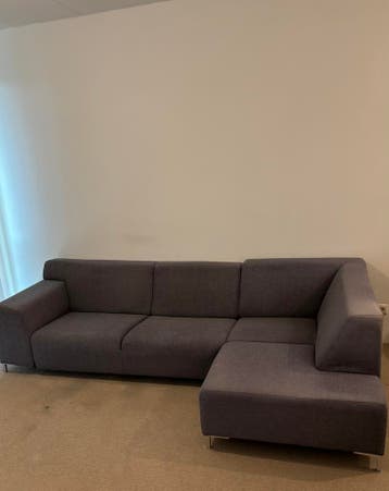 Hoekbank kleur grijs gratis ophalen. Lengte bank 275 cm lounge gedeelte 155 cm. Moet deze week weg!