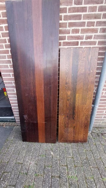 Een eetbarblad (195x60x4) van massief tropisch hardhout + een kleiner blad van dezelfde soort hout (150x50x4). Afgelakt met een dikke harde lak.