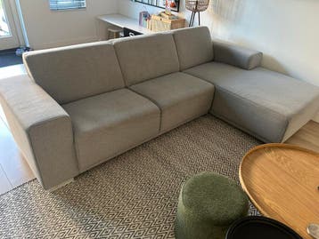 Deze l-bank van pronto wonen is lichtgrijs van kleur. De bank is 270 cm breed, 55 cm hoog en 80 cm diep. Het is een hoekbank met een stoffen bekleding, bevat lichte gebruikssporen (zie tweede foto).