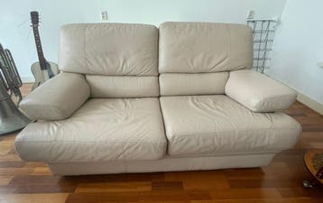 Deze tweezitsbank is gemaakt van leer en heeft een lichte kleur. De bank heeft twee zitkussens en twee rugkussens. De armleuningen zijn ook bekleed met leer. Er zijn wat kreukels zichtbaar in het leer